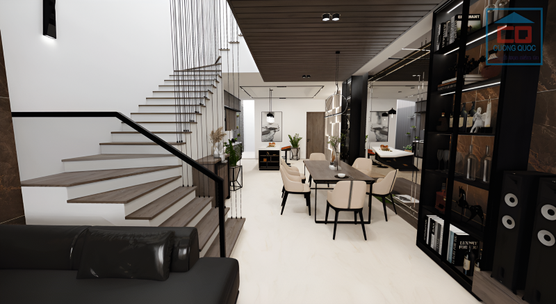 Phòng khách biệt thự liền bếp hiện đại có thể chọn gạch tông màu trắng vân đá để mở rộng tầm mắt, liền mạch toàn bộ kiến trúc phòng lớn