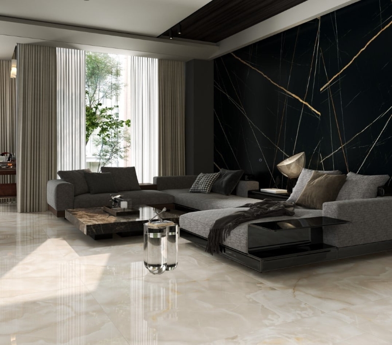 Chẳng hạn, một phòng khách có thể sử dụng gạch lát nền màu xám đá, gạch ốp tường màu kem sữa, kết hợp cùng bộ sofa màu xanh navy và các món đồ décor mạ vàng hoặc cam đất.