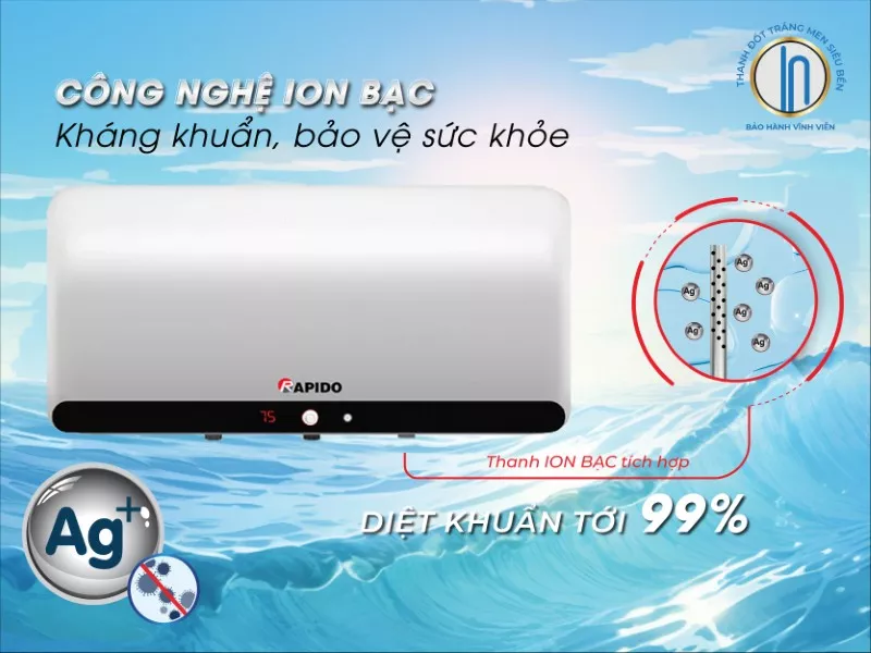 Rapido HA 15L được tích hợp công nghệ ion bạc Ag+, giúp hạn chế sự phát triển của vi khuẩn trong khoang chứa nước nóng. Nhờ đó, nguồn nước sử dụng luôn đảm bảo vệ sinh, đặc biệt phù hợp với gia đình có trẻ nhỏ hoặc người lớn tuổi, nơi yếu tố an toàn sức khỏe được đặt lên hàng đầu.
