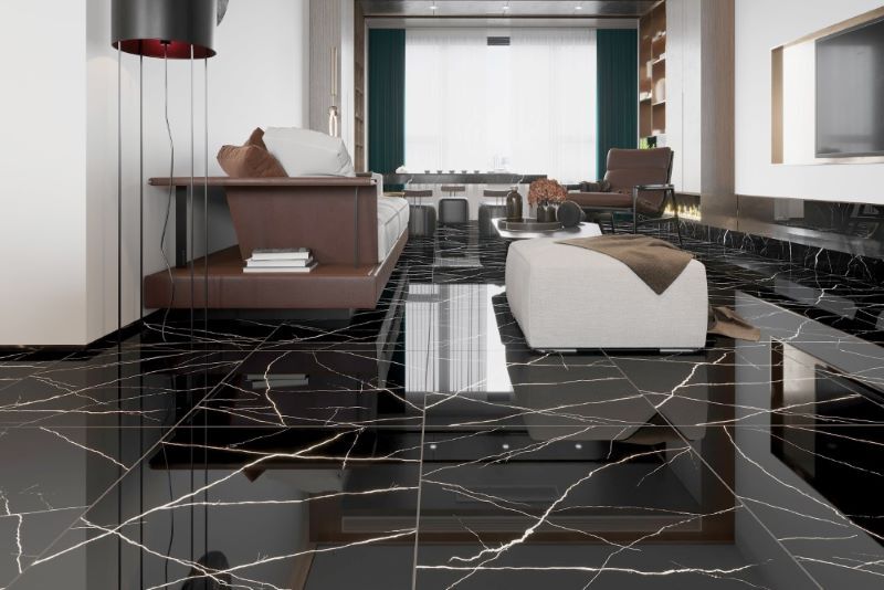 Không gian sang trọng, hiện đại với nền gạch đen bóng vân mảnh trắng, tạo chiều sâu và nổi bật nội thất.