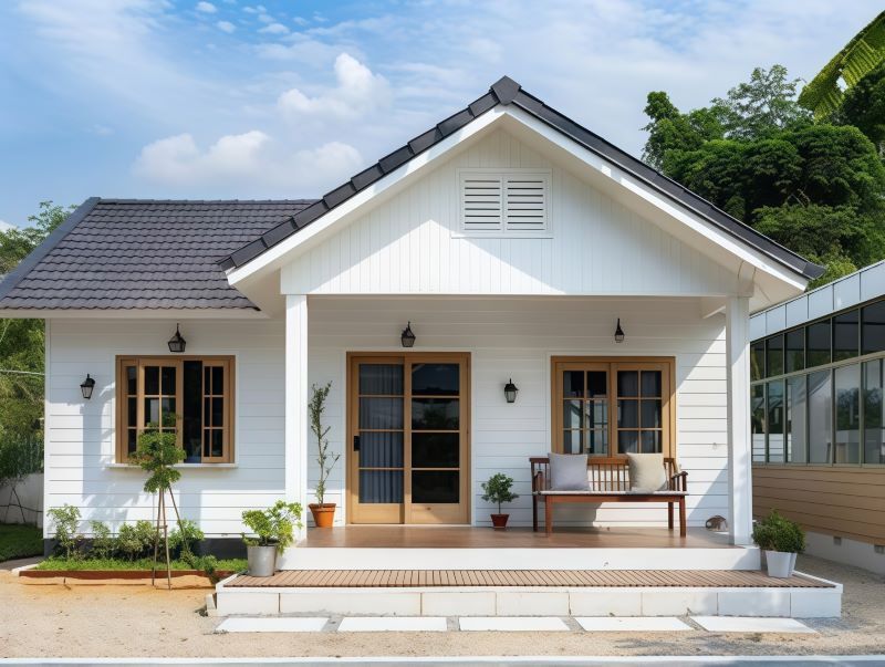 Ngôi nhà cấp 4 áp dụng mái Thái với mái ngói dốc giúp thoát nước nhanh và chống nóng hiệu quả. Thiết kế mái xanh kết hợp tường trắng tạo vẻ đẹp hiện đại, hài hòa. Cửa kính rộng giúp nhà sáng, thoáng. Mái Thái không chỉ tăng tính thẩm mỹ mà còn phù hợp với khí hậu Việt Nam, giúp nhà bền và mát mẻ hơn.