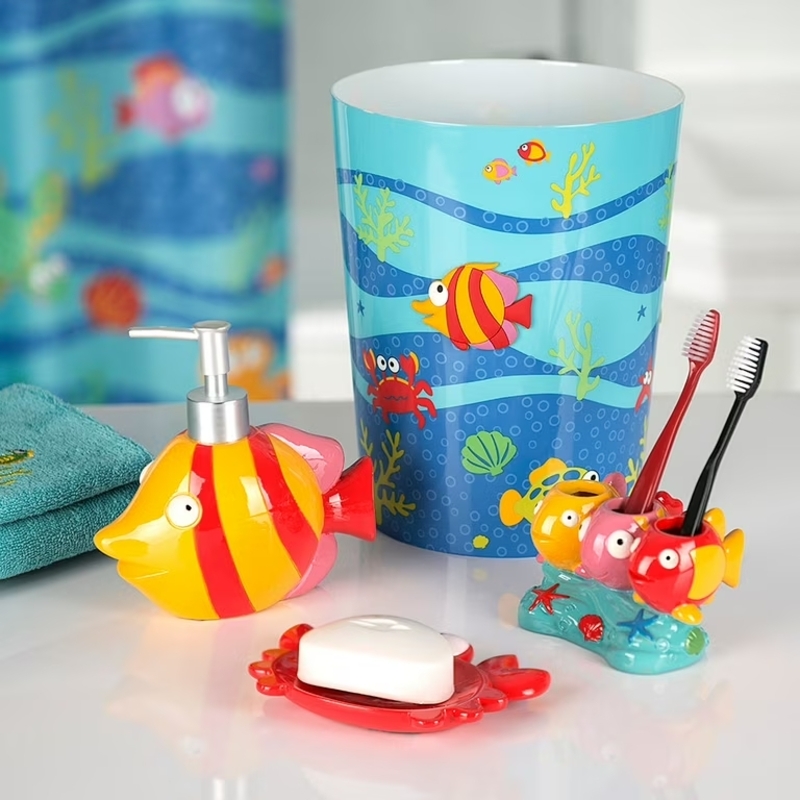 Tận dụng các miếng dán tường, tranh ảnh có chủ đề thiên nhiên, động vật, hay nhân vật hoạt hình yêu thích của trẻ là cách để tạo thêm sức hút cho phòng tắm. Các phụ kiện như giá treo khăn, hộp đựng bàn chải, và ly súc miệng cũng có thể chọn loại có hình dáng ngộ nghĩnh, giúp phòng tắm trở thành không gian vui vẻ và giàu tính sáng tạo.