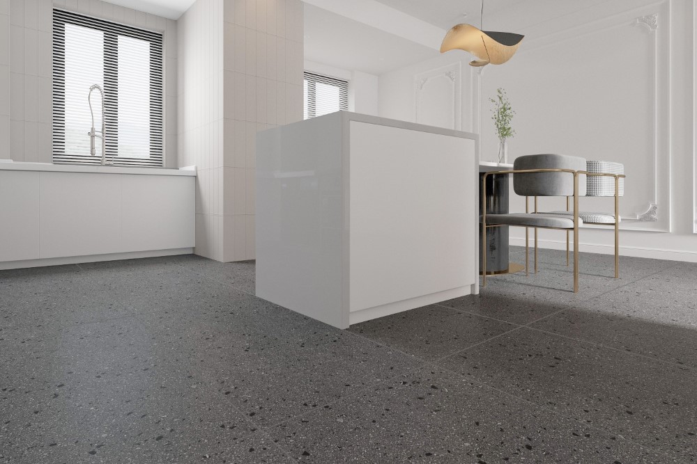Tông xám đậm trung tính kết hợp với vân đá li ti như bê tông mài terrazzo, mang đến vẻ đẹp công nghiệp hiện đại (industrial style), dễ phối với nội thất gỗ, kính, kim loại…