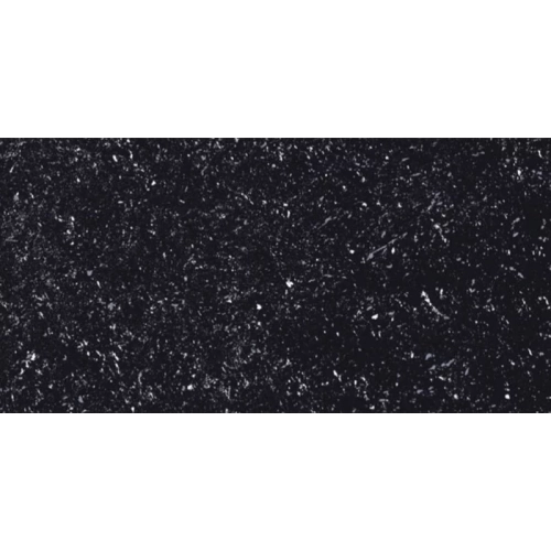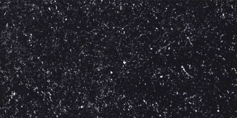Bề mặt của gạch men bóng, mô phỏng đường vân đá hoa cương với những đường chấm trắng - đen rõ nét, lấp lánh như ánh kim hoặc đá thạch anh, nhìn vào cảm giác như một bầu trời đêm đầy sao. Các chi tiết trắng, xám nhỏ xen kẽ làm tăng chiều sâu thị giác và tạo cảm giác sần nhẹ.