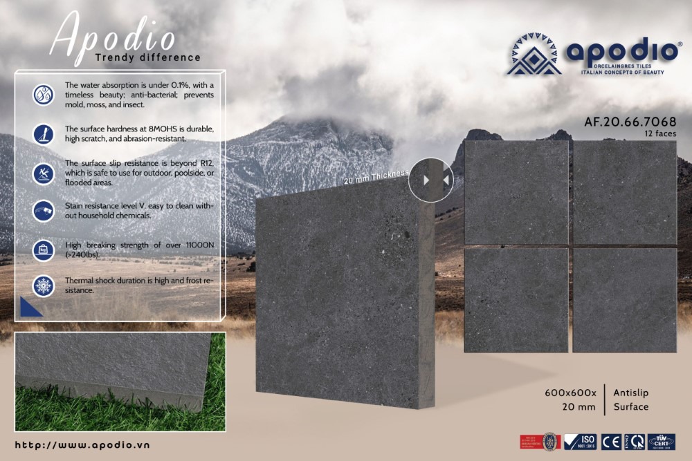 Gạch 60x60 dày 20mm vân đá Basalt xám đen lát sân vườn Apodio AF20667068