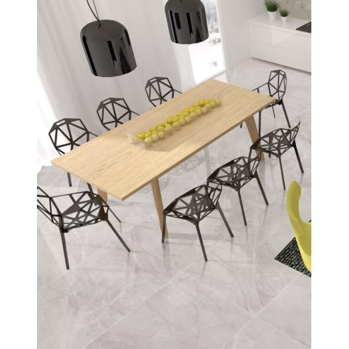 Chất liệu Porcelain cao cấp, cứng cáp và bền bỉ, thách thức mọi tác động ngoại lực, đảm bảo sàn nhà luôn vững chãi theo năm tháng. Bề mặt men bóng loáng, không chỉ phản chiếu ánh sáng tuyệt đẹp mà còn dễ dàng lau chùi, giữ cho không gian sống của bạn luôn sạch sẽ và sáng bóng. Vân đá tự nhiên tinh tế, được mô phỏng tỉ mỉ trên từng viên gạch, mang đến vẻ đẹp sang trọng và hiện đại, phù hợp với mọi phong cách thiết kế nội thất.