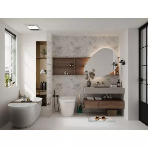 Gạch Trung Quốc HLTQ612032HD gây ấn tượng mạnh mẽ nhờ thiết kế hoa văn nghệ thuật tinh xảo, mô phỏng họa tiết hoa lá trên nền màu xám nhạt. Các chi tiết bông hoa lớn kết hợp cùng hoa văn nhỏ xen kẽ tạo nên một bố cục hài hòa, mang hơi thở cổ điển nhưng vẫn giữ được nét hiện đại, thanh lịch. Hiệu ứng men matt giúp hoa văn trở nên mềm mại, tự nhiên hơn và mang đến cảm giác sang trọng cho toàn bộ không gian.