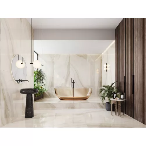 Sản phẩm được chế tác từ xương gạch Porcelain cao cấp, nổi bật với độ bền chắc, khả năng chịu lực, chống trầy xước và thấm hút nước tối ưu. Lớp phủ Polish bóng mịn làm tăng thêm sự sang trọng, đồng thời phản chiếu ánh sáng, khiến không gian luôn bừng sáng và đẳng cấp.