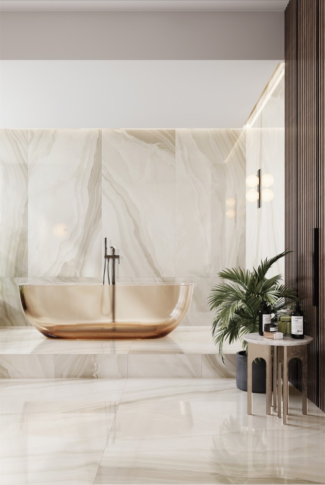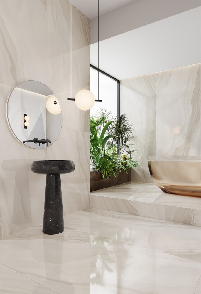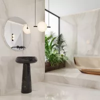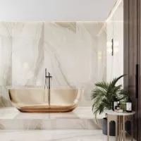 Ấn tượng ngay từ cái nhìn đầu tiên, gạch Trung Quốc HLTQ918050EL mang vẻ đẹp độc đáo của đá onyx tự nhiên, với gam màu trắng kem nhẹ nhàng hòa cùng những dải vân xám uyển chuyển. Sự kết hợp tinh tế này tạo nên chiều sâu thị giác, giúp không gian thêm phần trang nhã và hiện đại.