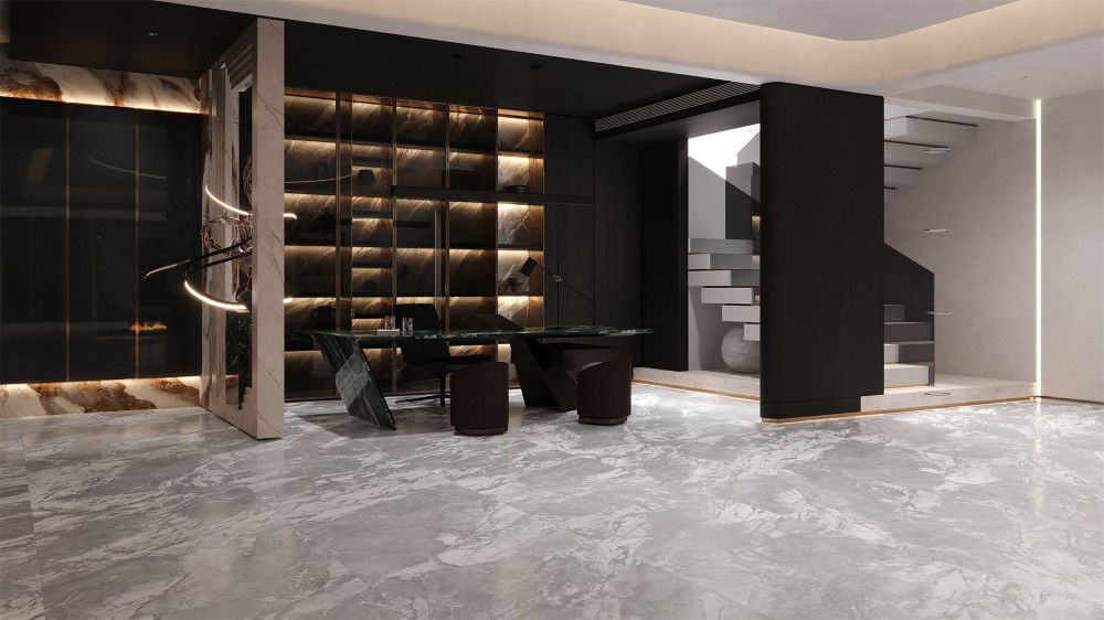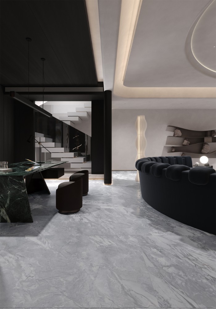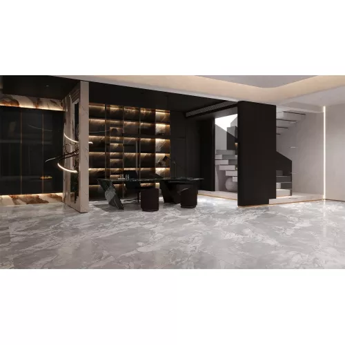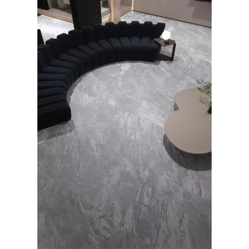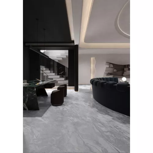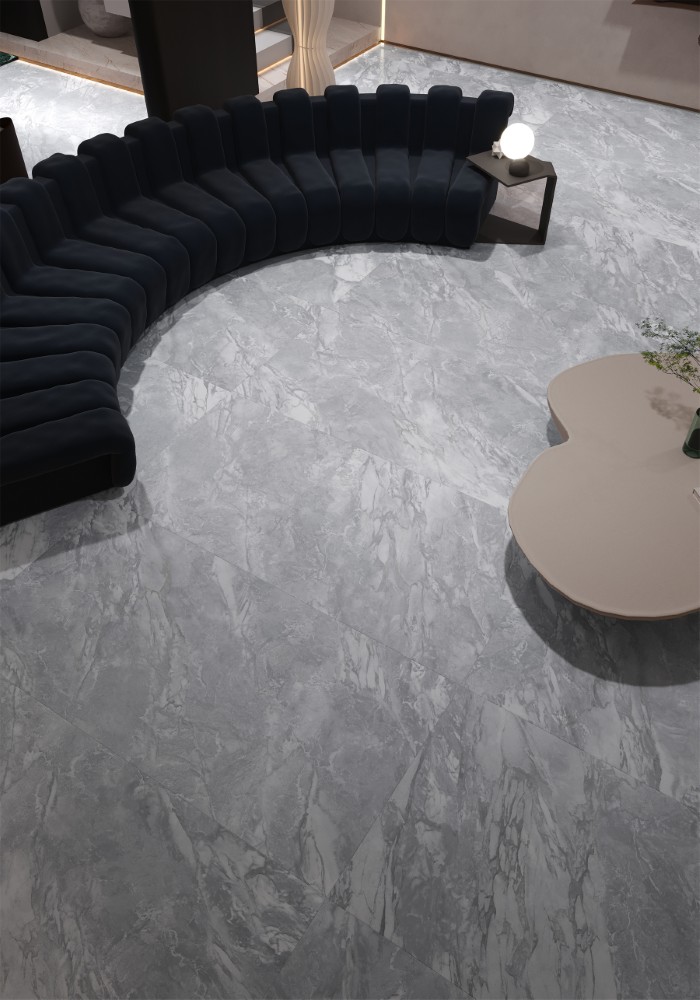 Bề mặt gạch được phủ men bóng hiện đại, tôn lên vẻ đẹp sang trọng và tạo hiệu ứng ánh sáng giúp không gian trở nên rộng rãi, thoáng đãng hơn. Vân đá tự nhiên nhẹ nhàng, hòa quyện giữa gam xám và trắng, mang đến cảm giác trang nhã, phù hợp với nhiều phong cách nội thất từ hiện đại đến tối giản.