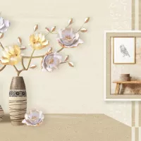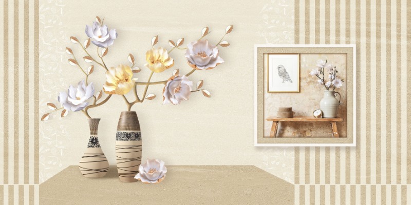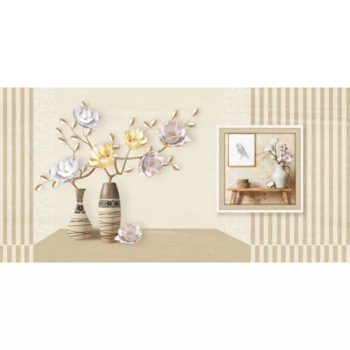 Họa tiết chính là hình ảnh cặp bình hoa nghệ thuật phối cùng các đường sọc dọc tinh tế hai bên, tạo cảm giác cân đối và hài hòa. Những bông hoa 3D phối màu nhẹ nhàng, điểm xuyết ánh vàng – tím pastel vừa mềm mại, vừa nổi bật, giúp không gian trở nên sinh động và có chiều sâu. Bên cạnh đó, chi tiết khung tranh và bàn gỗ được lồng ghép khéo léo như một góc trưng bày nghệ thuật, mang lại cảm giác ấm áp và đầy tính thẩm mỹ.