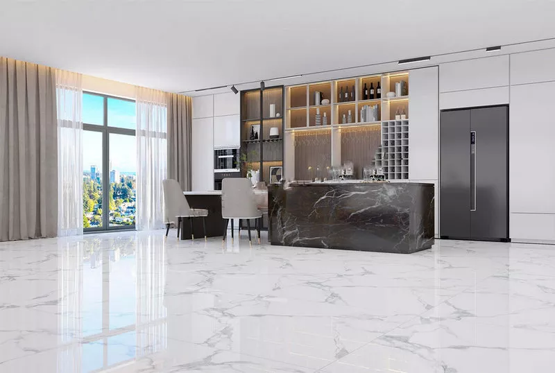 Là mẫu gạch lát nền Viglacera 120x120 kích thước lớn tạo không gian thoáng đạt và rộng rãi. Đồng thời màu gạch trắng vân đá marbel tinh tế còn là điểm cộng giúp không gian được sang trọng hơn.